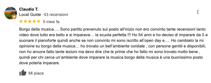 "Ciao! Sono Paolo, il direttore del Borgo della Musica. Se sei qui, probabilmente vuoi imparare a suonare o a cantare, oppure desideri che tuo figlio lo faccia.