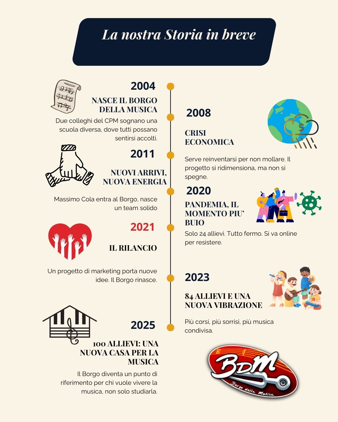 Nel 2004, due amici — Paolo Sportelli e Paolo Morbini — sognavano un luogo diverso dove insegnare musica. Non una scuola fatta di regole rigide e competizione, ma uno spazio umano, accogliente, dove ogni allievo potesse sentirsi a proprio agio, rispettato nei suoi tempi e valorizzato per quello che è.